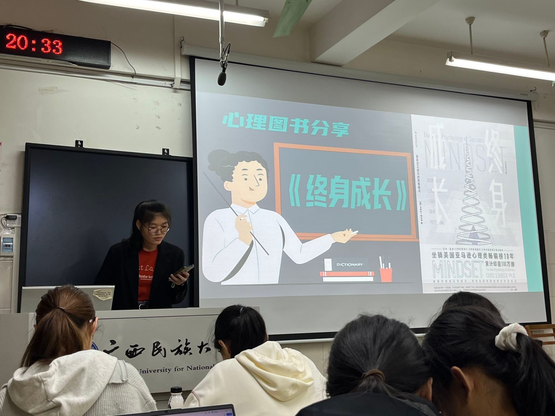 随后,在图书分享环节,谭永博同学分享《终身成长》一书,他利用PPT向同学们展示了书籍的具体内容。该书由美国心理学教授卡罗尔·德韦克撰写,介绍了思维模式的力量以及固定型思维与成长型思维。