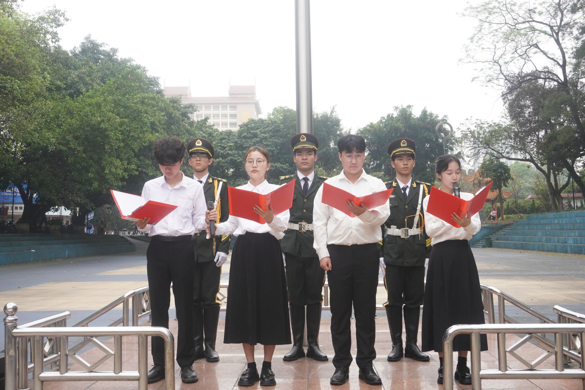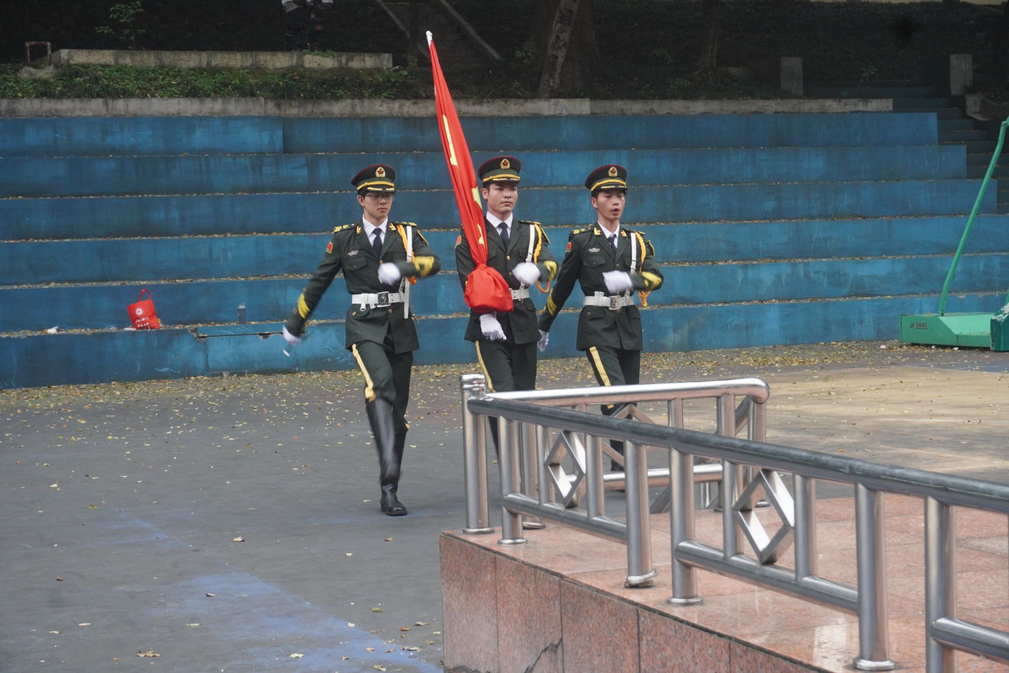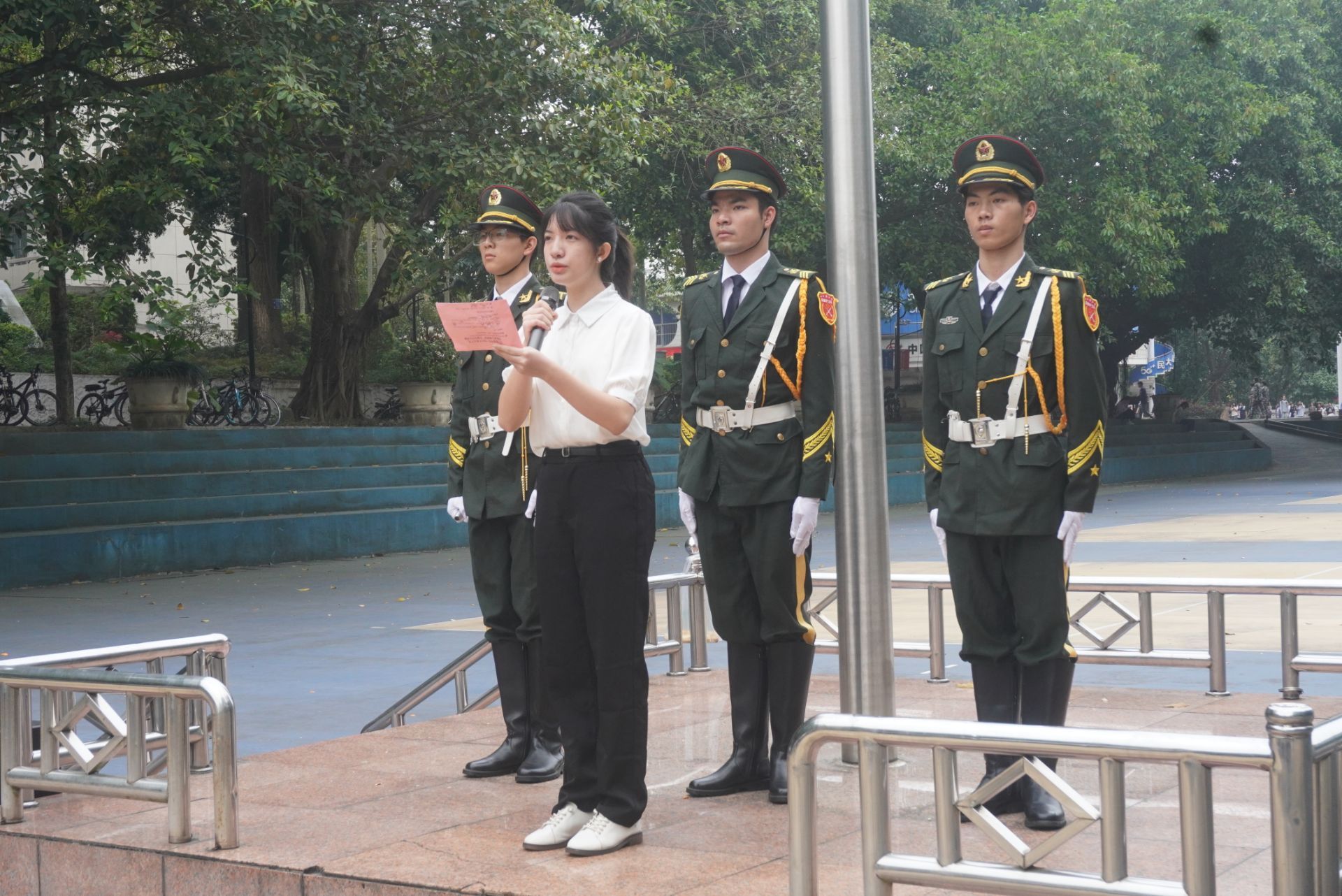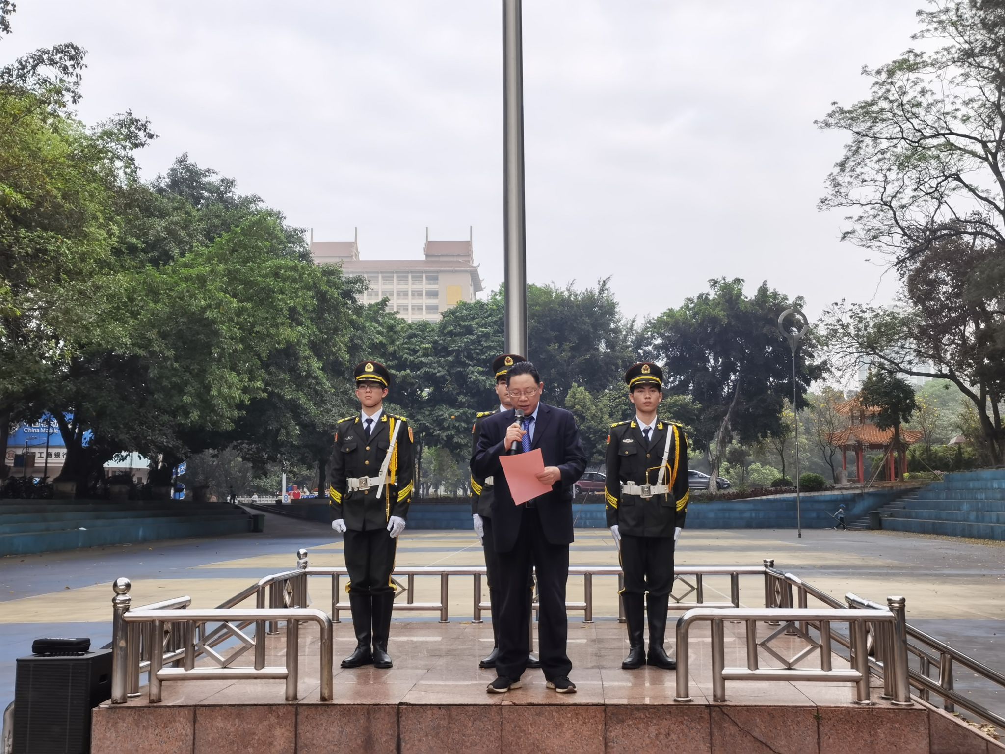 学院党委书记蔡其明在国旗下讲话。他说,今年是新中国成立75周年,是深入实施“十四五”发展规划的攻坚之年,也是学校贯彻落实第四次党代会精神,谋写新篇的开局之年。站在新的起点,我们要更加紧密地团结在以习近平同志为核心的党中央周围,全面贯彻落实党的二十大和二十届二中全会精神,认真学习贯彻习近平总书记对广西重大方略要求,牢记习近平总书记视察民族大学时对广大青年学子的谆谆教诲,振奋龙马精神,持续深化人才培养改革,扎实推进本科教育教学审核评估、专业工程认证、学科专业建设等重点工作,塑造高质量发展新动能,向新中国成立75周年献礼。