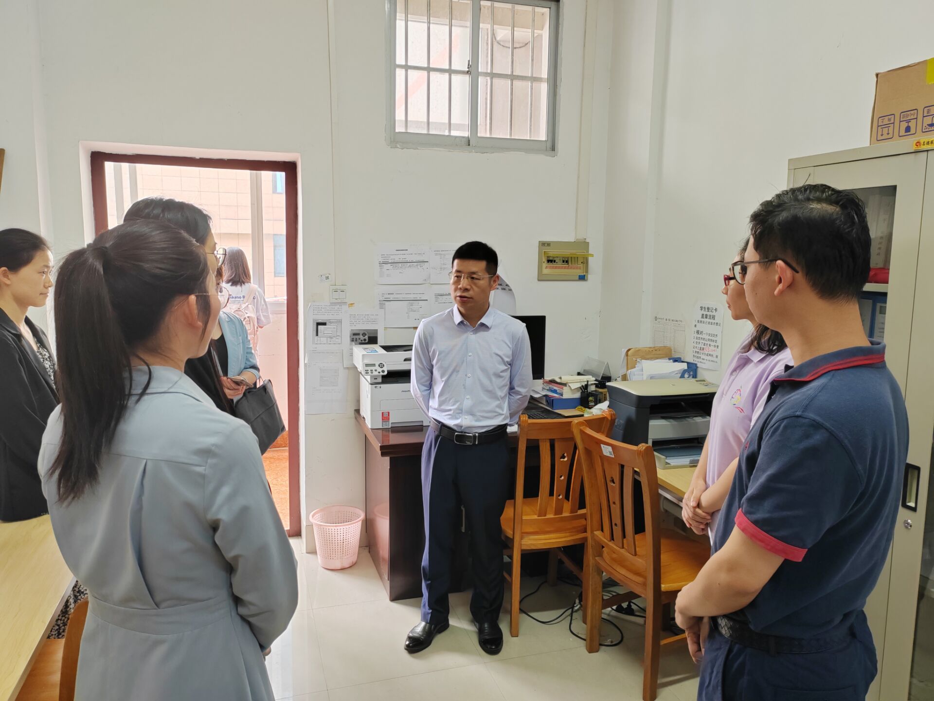 邓国彬现场检查了辅导员工作场所、工作状态,听取学院有关负责人关于学生思想政治教育、学风建设、文化宣传,尤其是学生安全教育工作的汇报,了解学院在学生教育管理建章立制、做实做细方面的举措。