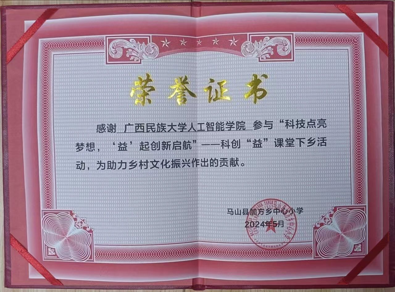 5月12日,m88,m88.com智能科学与技术系副主任蒋权老师、2020级智能科学与技术1班何达、2020级人工智能1班陈邵龙同学前往马山县加方乡中心小学参加由中国计算机学会(CCF)南宁分部、南宁市工人文化宫联合承办的“科技点亮梦想,‘益’起创新启航”——CCF公益日暨科创“益”课堂下乡活动。