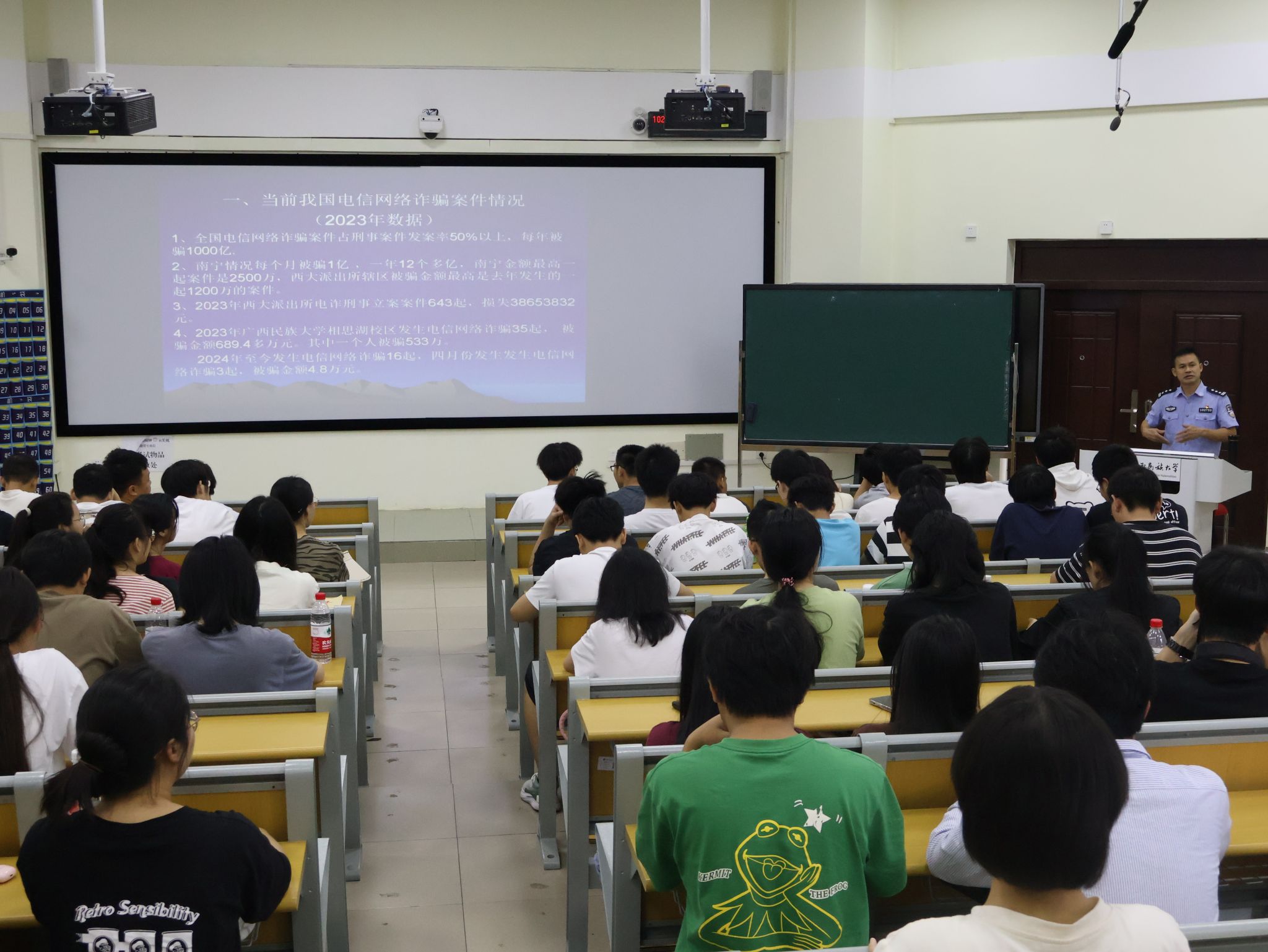 5月21日下午,m88,m88.com于学友楼102室举行“提升网络安全意识,防范电信网络诈骗”专题知识讲座。本次讲座由南宁市公安局西乡塘分局三级高级警长、驻广西民族大学联络官韦振豪主讲。