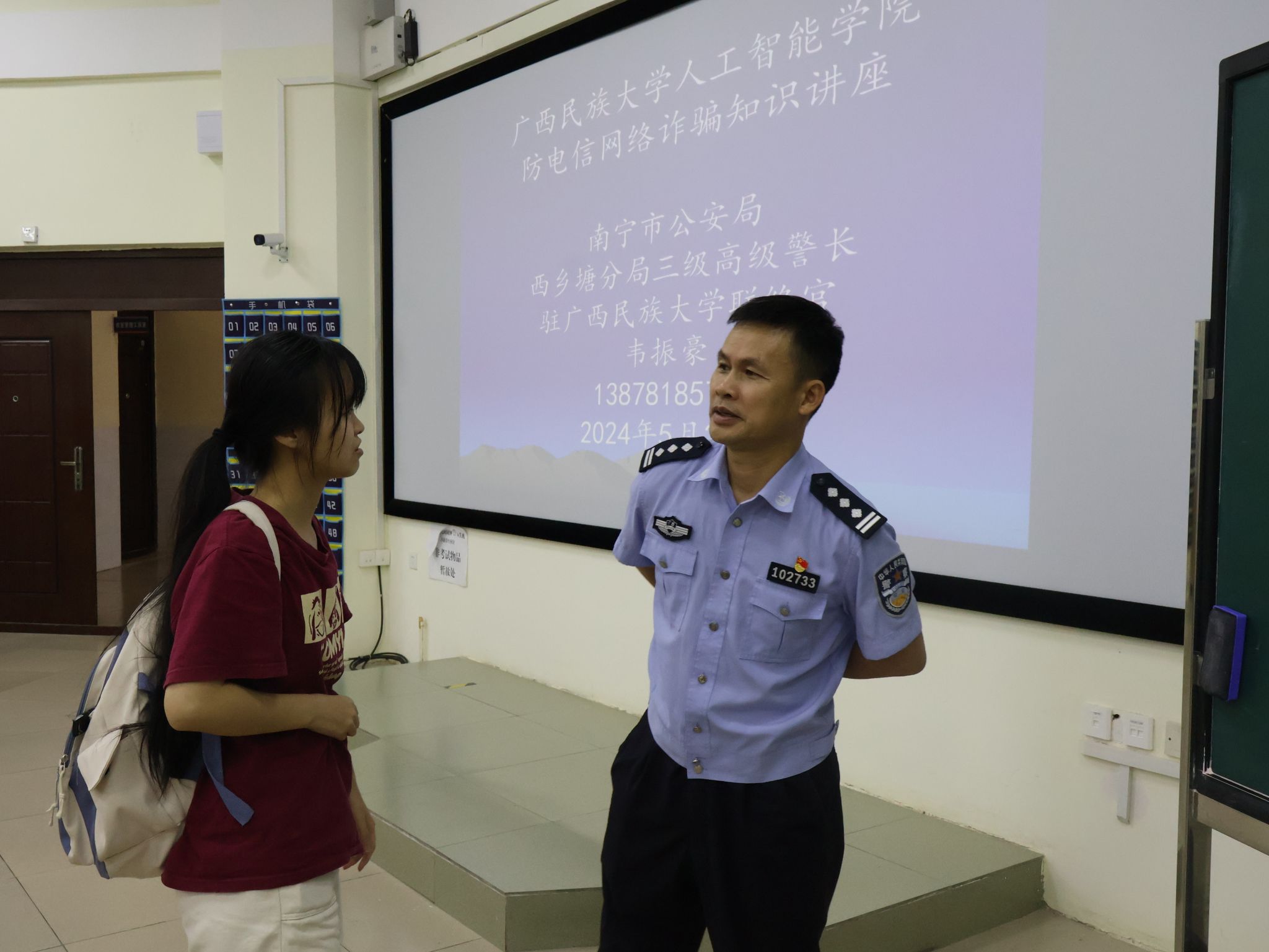 在互动环节中,韦振豪警官以轻松愉快的语言风格与同学们互动交流,确保同学们对防范电信诈骗知识入耳、入脑、入心,受到了同学们的广泛欢迎。