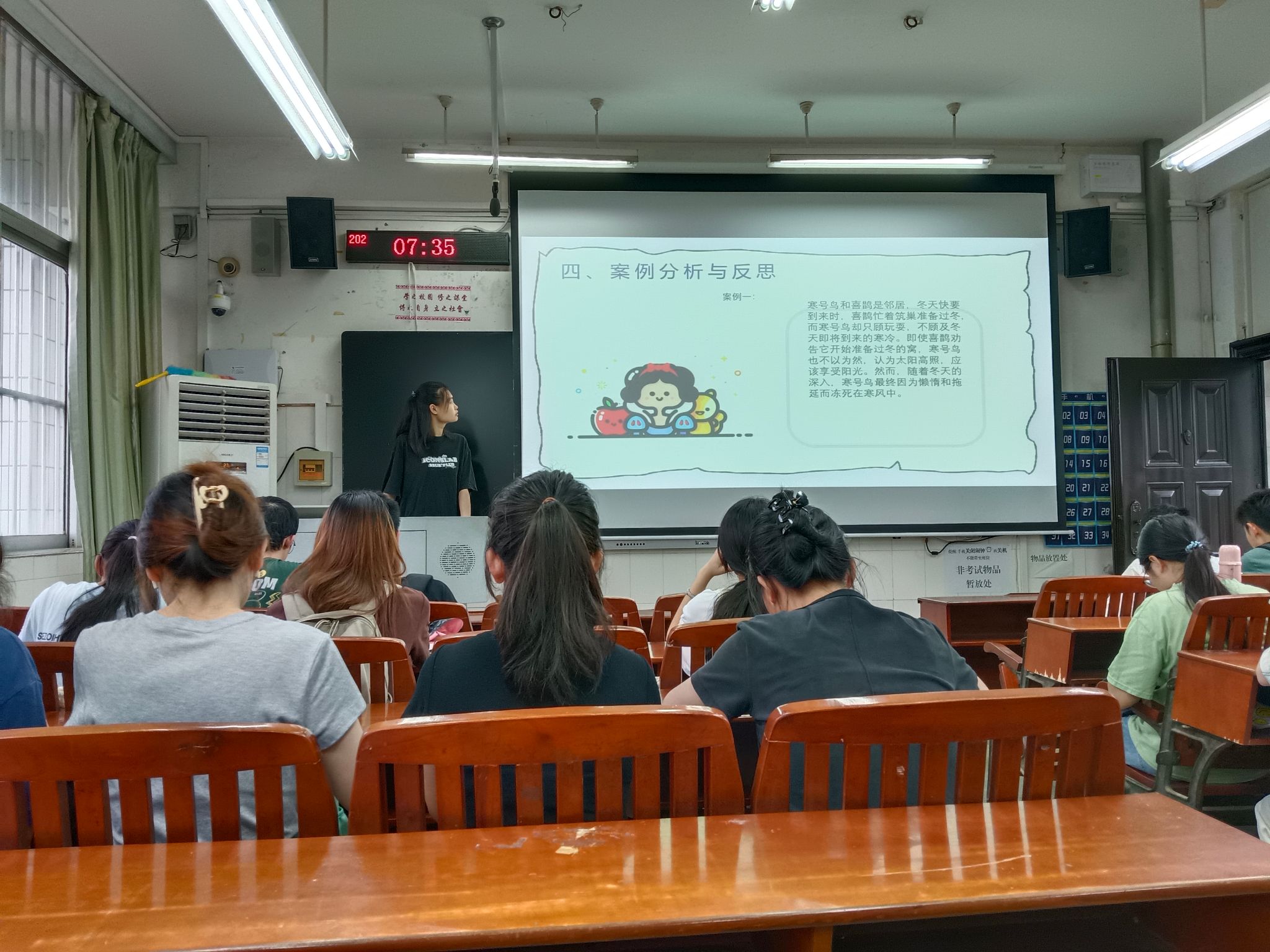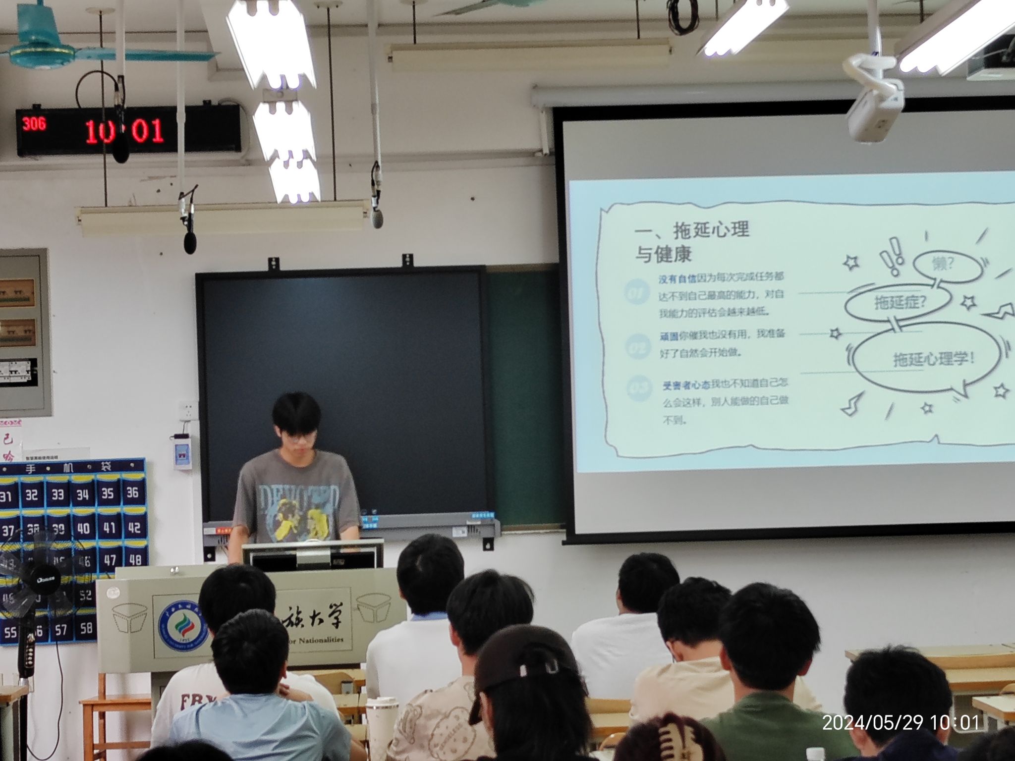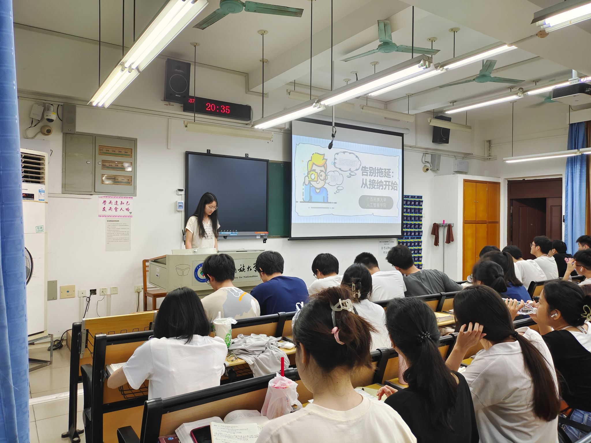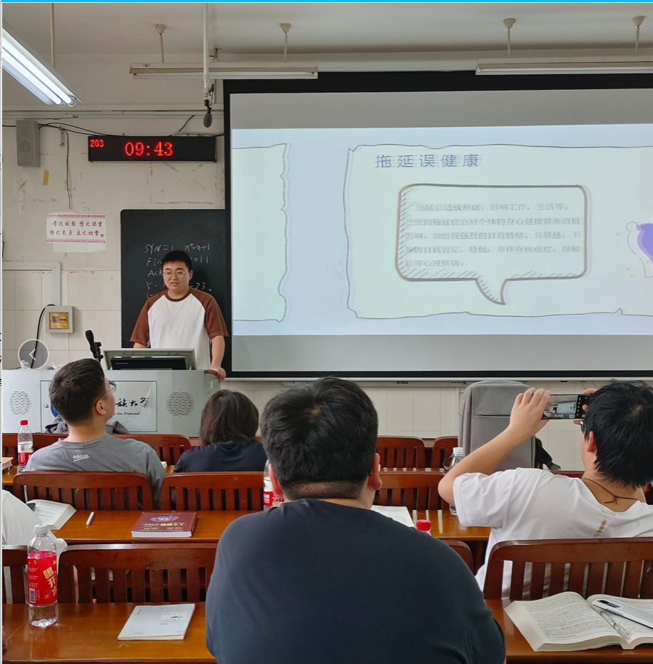 各班组织召开了“告别拖延,行接纳开始”主题班会。心理委员们结合生动真实的案例,向同学们介绍了拖延对个人行为和生活的影响,以及大家喜欢拖延的原因。同时,还向同学们介绍了一些实用的调节技巧,如接纳自己、将任务分解等。