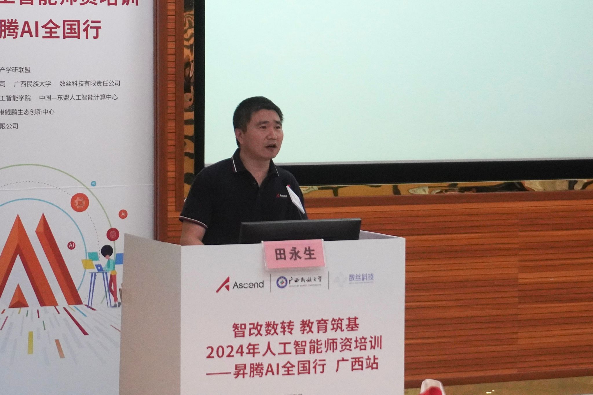 华为广西副总经理田永生在致辞中回顾了昇腾AI产业生态近三年的发展历程,并强调昇腾产品及技术体系已成为国产化AI的首选。他详细阐述了未来广西昇腾生态的发展策略,并表示华为将继续加大投入,与广西高校紧密合作,共同推动人工智能教育事业的进步。