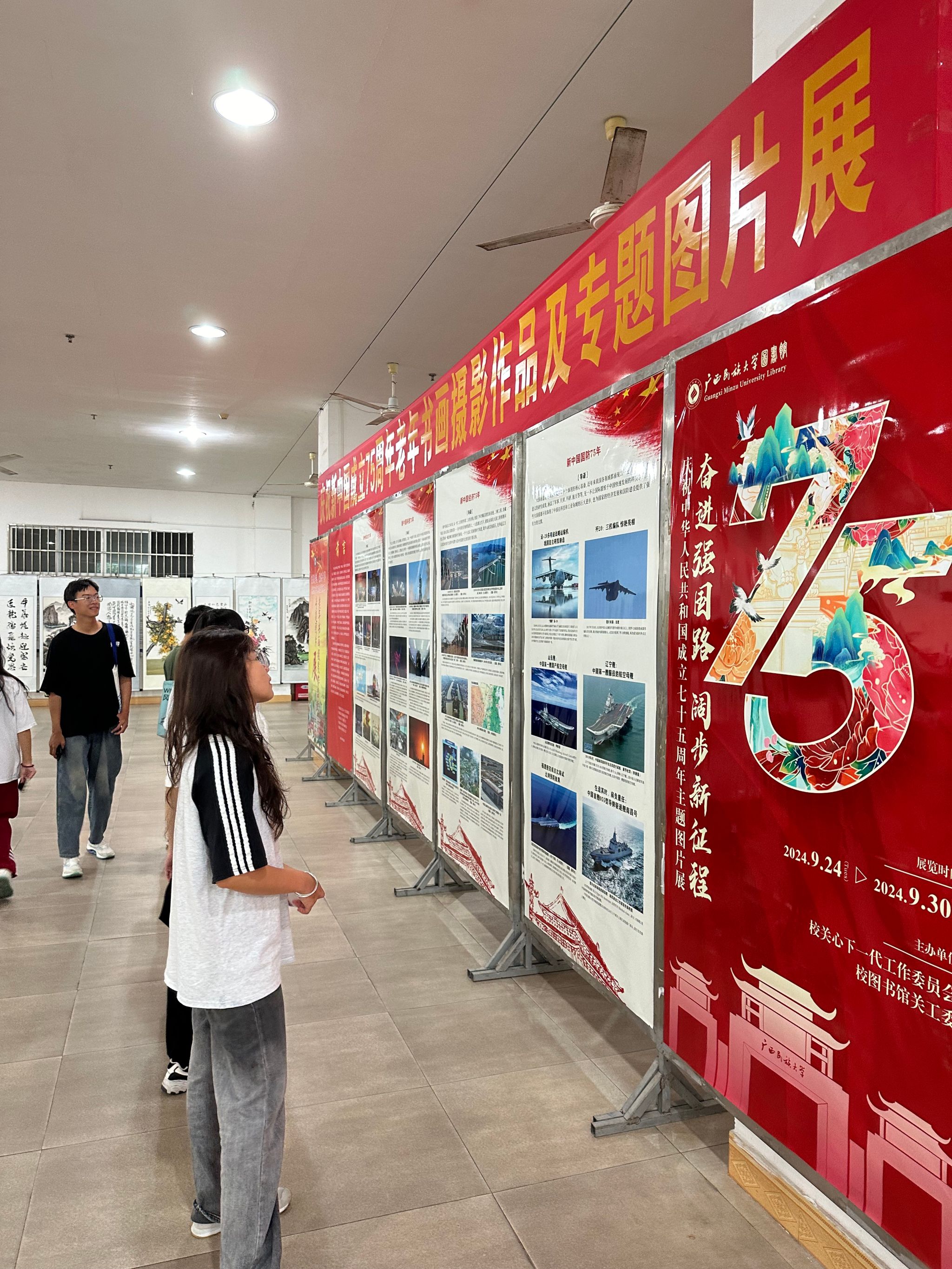 9月27日上午,m88,m88.com组织2024级各班级新生代表进行“庆祝新中国成立75周年书画作品及专题图片展”观展活动。展览以艺术为媒,浓缩时代精华,引领新生穿越历史长廊,感受国家脉搏。