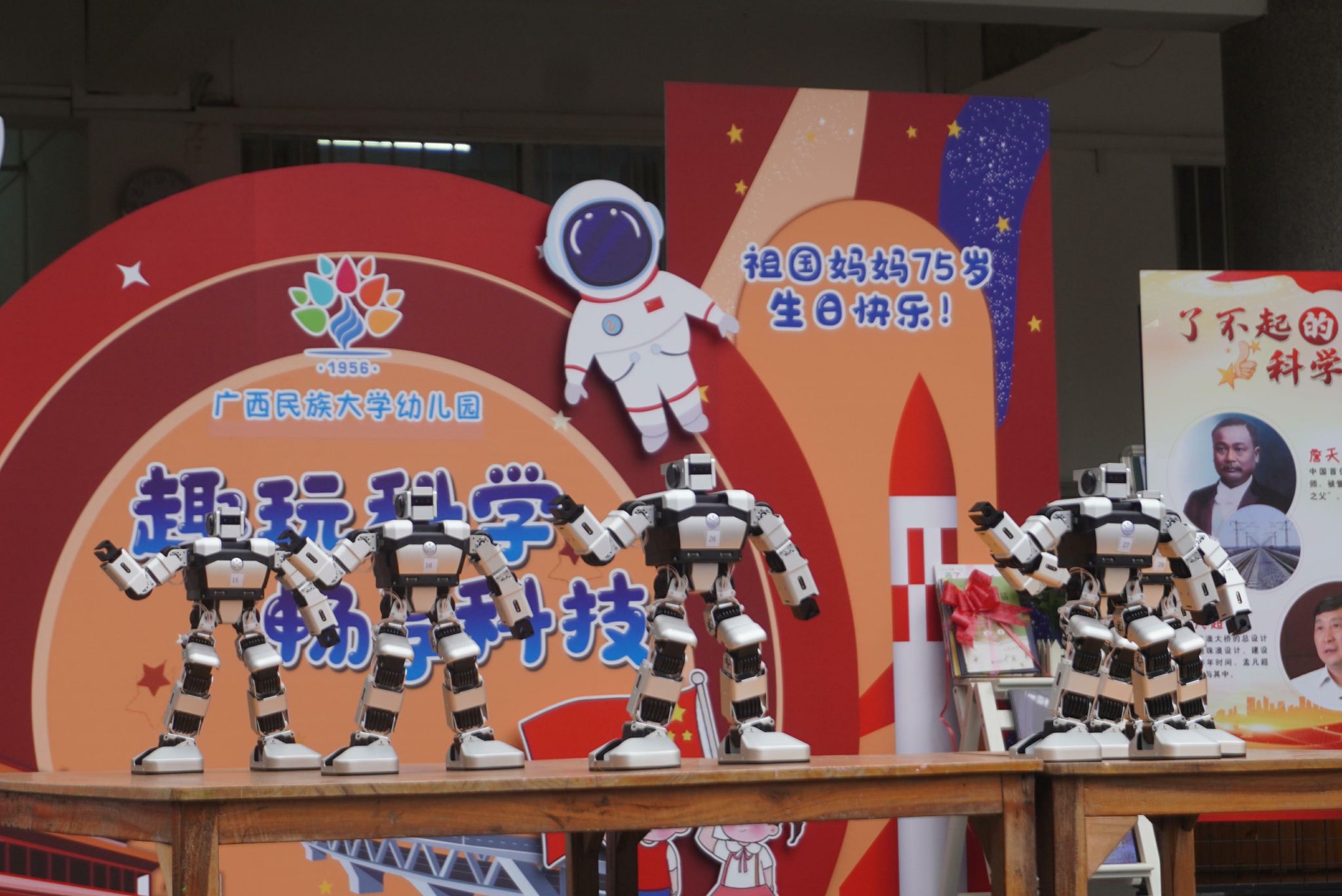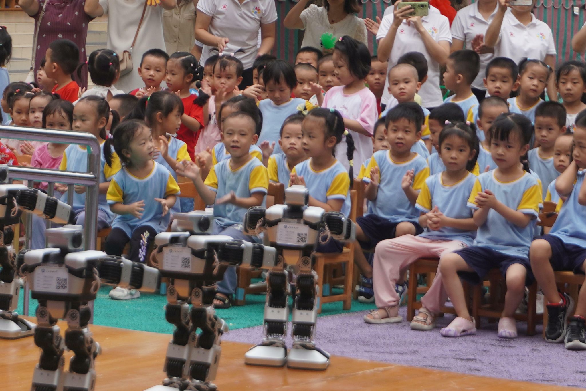 机器狗的表演令人意犹未尽,紧接着人形机器人登场了,为小朋友们展现了一段精彩的齐舞。