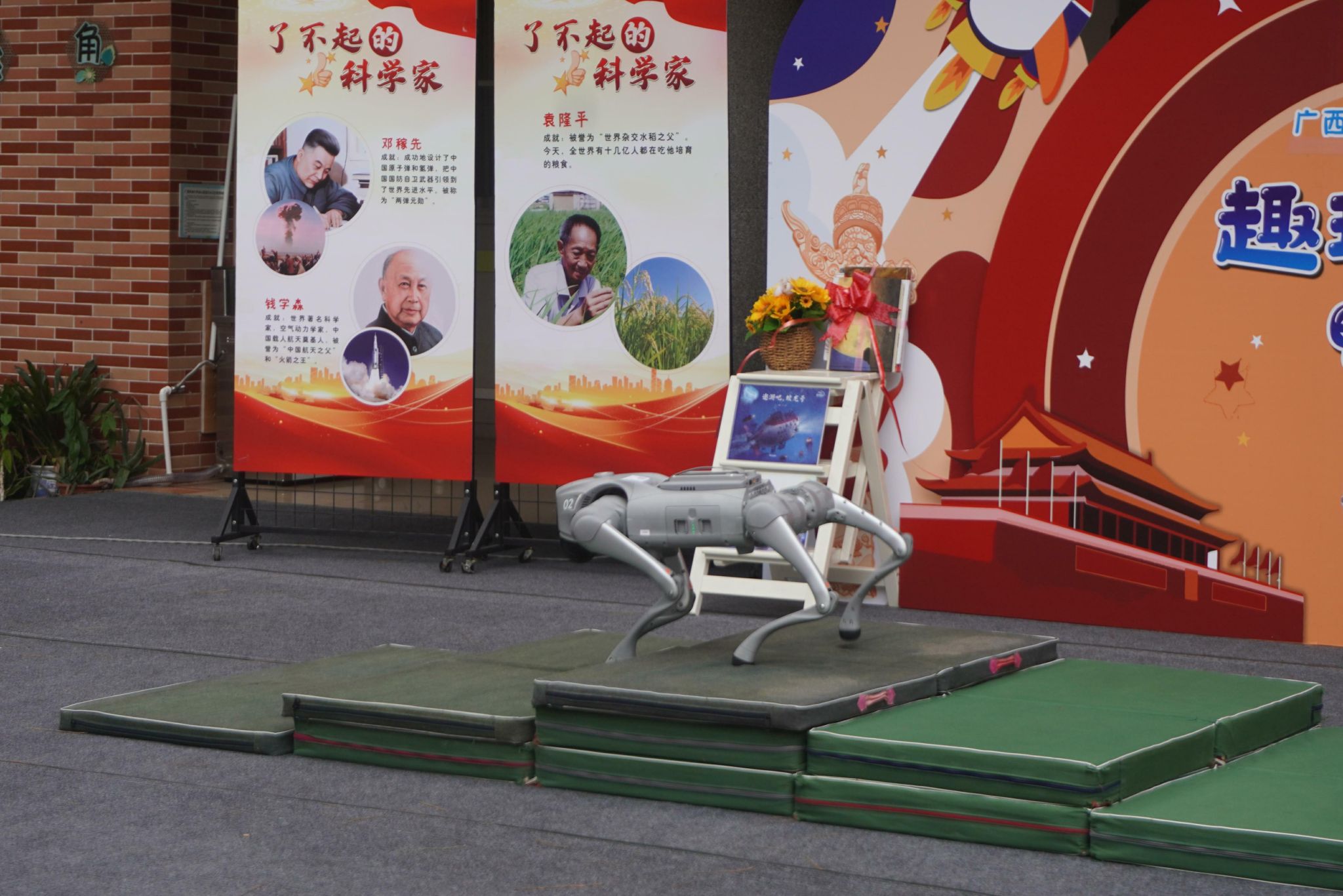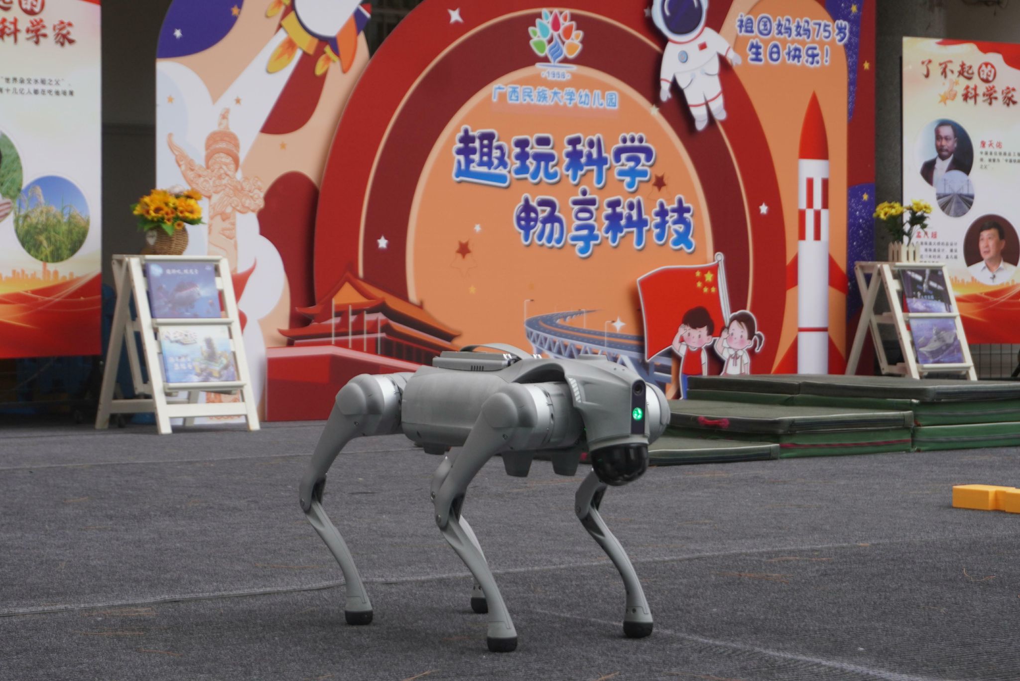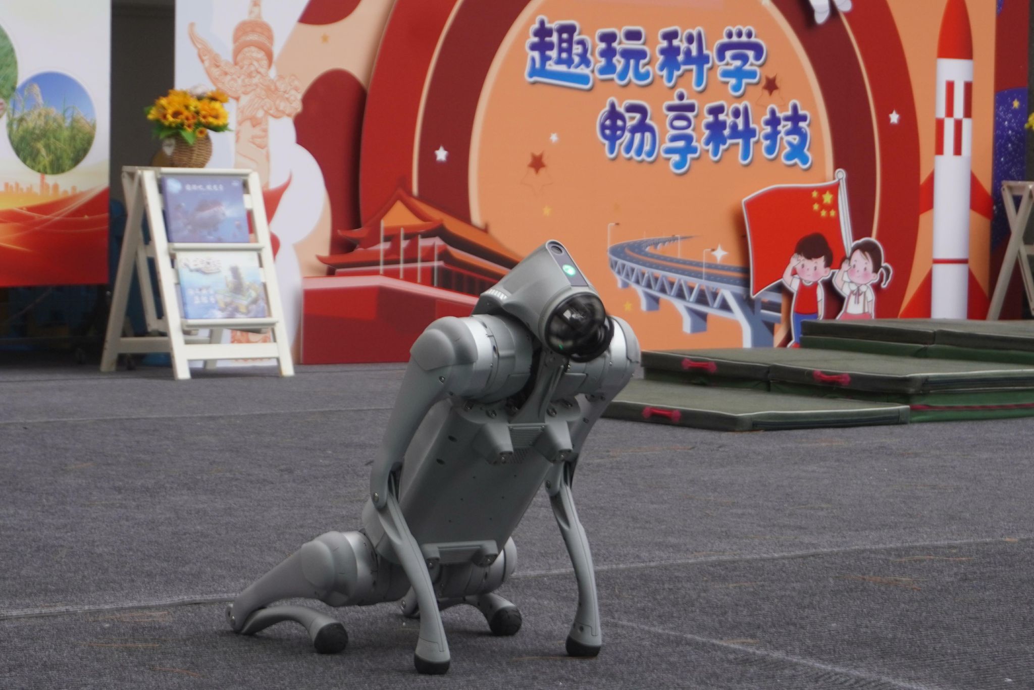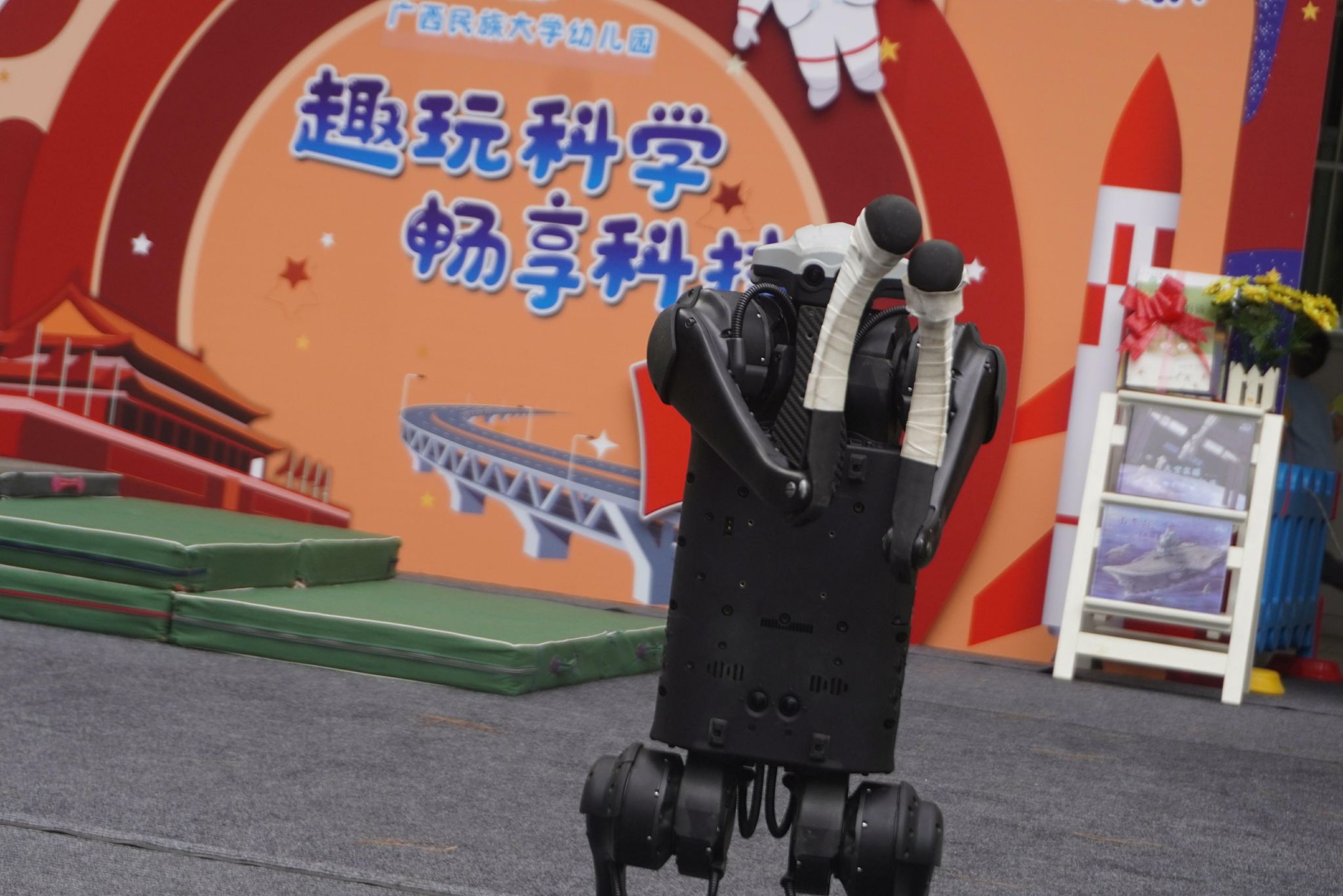 我院的机器狗“笨笨”和“小黑”早已在舞台两侧就位,快速进入了表演状态,它们双脚站立一起给小朋友们做出“拜年”的姿势,可爱可掬的模样引得小朋友们发出连连惊喜、愉悦之声。随后“笨笨”带着轻快、灵敏的步伐跳跃前进,到达“楼梯”,切换至爬行模式,以优雅、从容的姿态上下“楼梯”,最后与“小黑”汇合共同表演舞蹈,这一套动作下来直接收获了小朋友们的欢心,令他们目不转睛,掌声热烈。