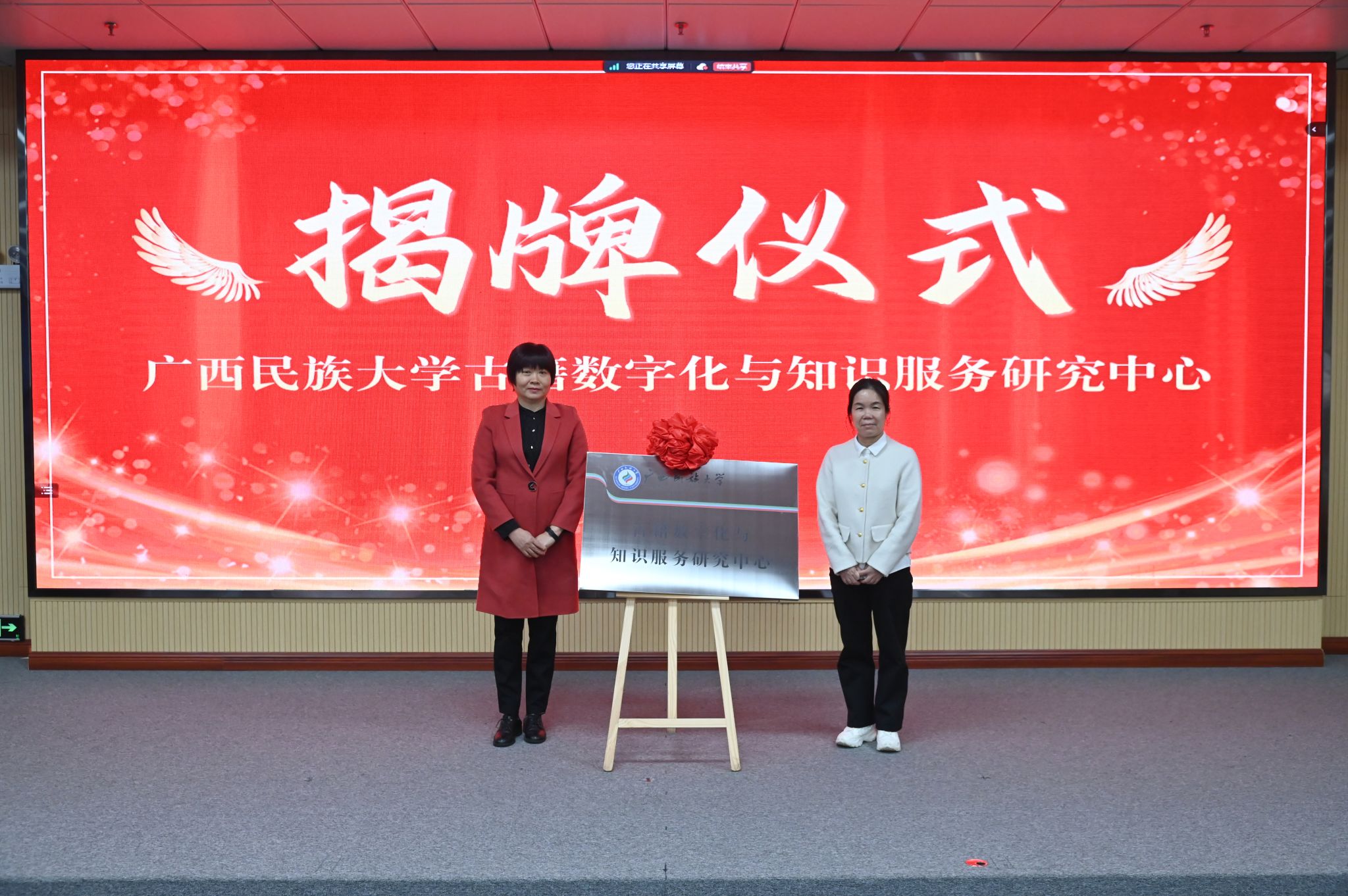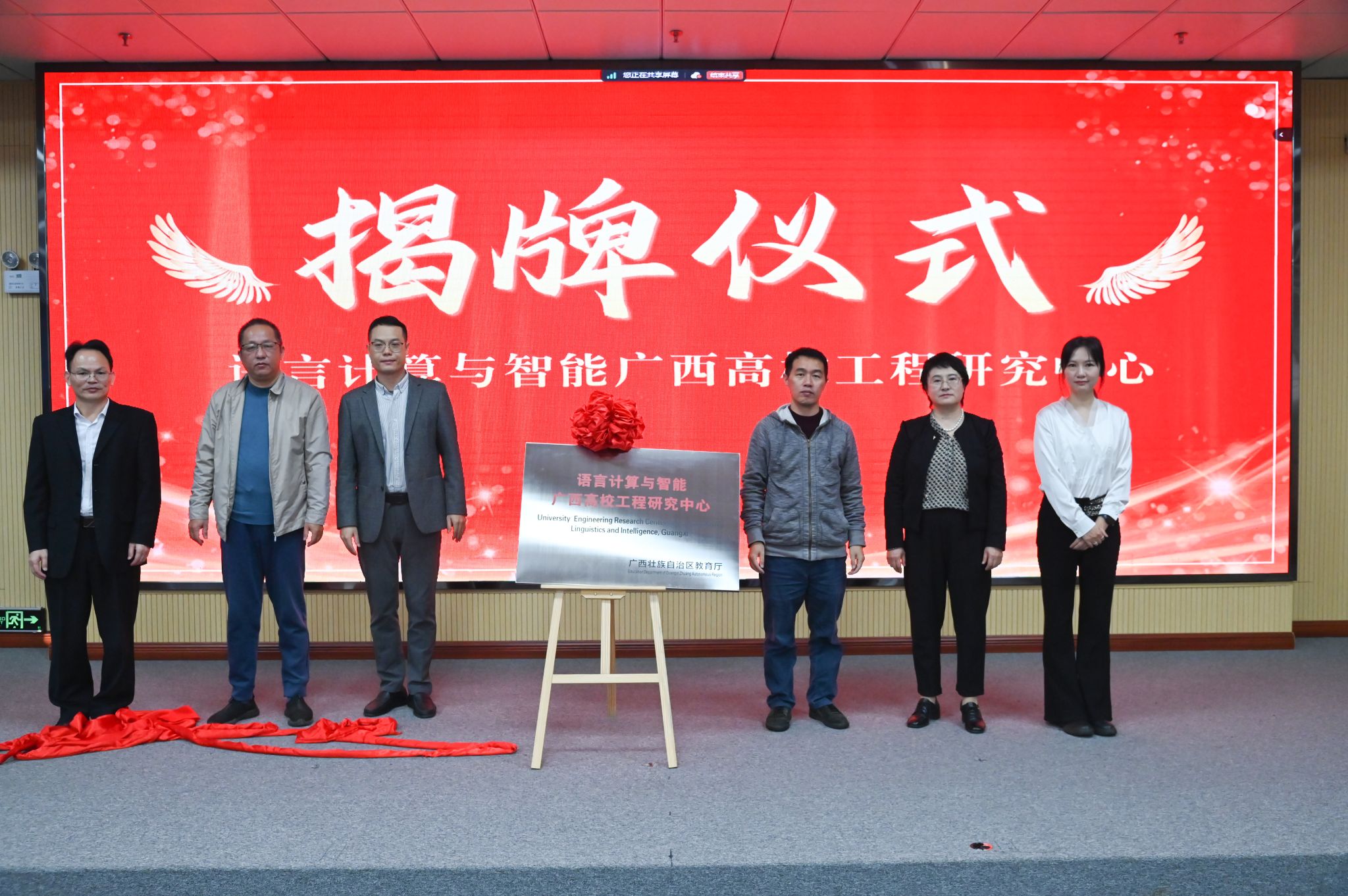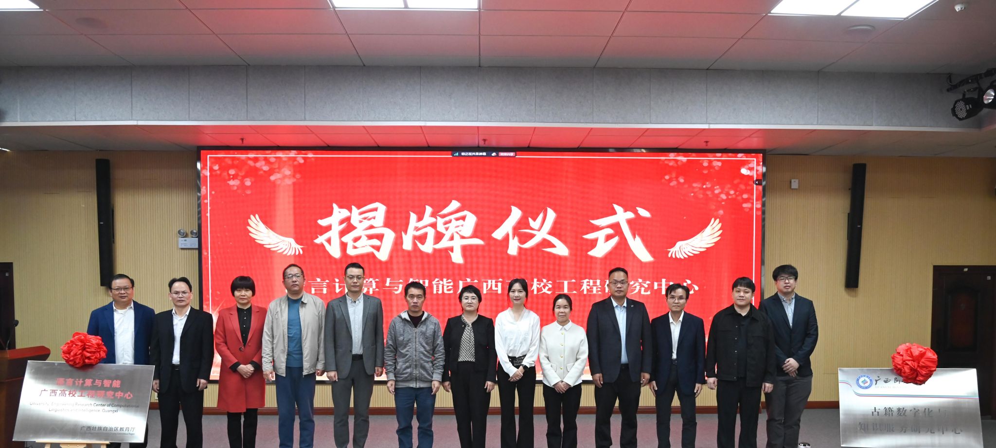 韦方奇、唐国吉、秦董洪、赵小兵、黄桂敏、杨莹共同为语言计算与智能广西高校工程研究中心揭牌。李再莲与葛丽娜为古籍数字化与知识服务研究中心揭牌。