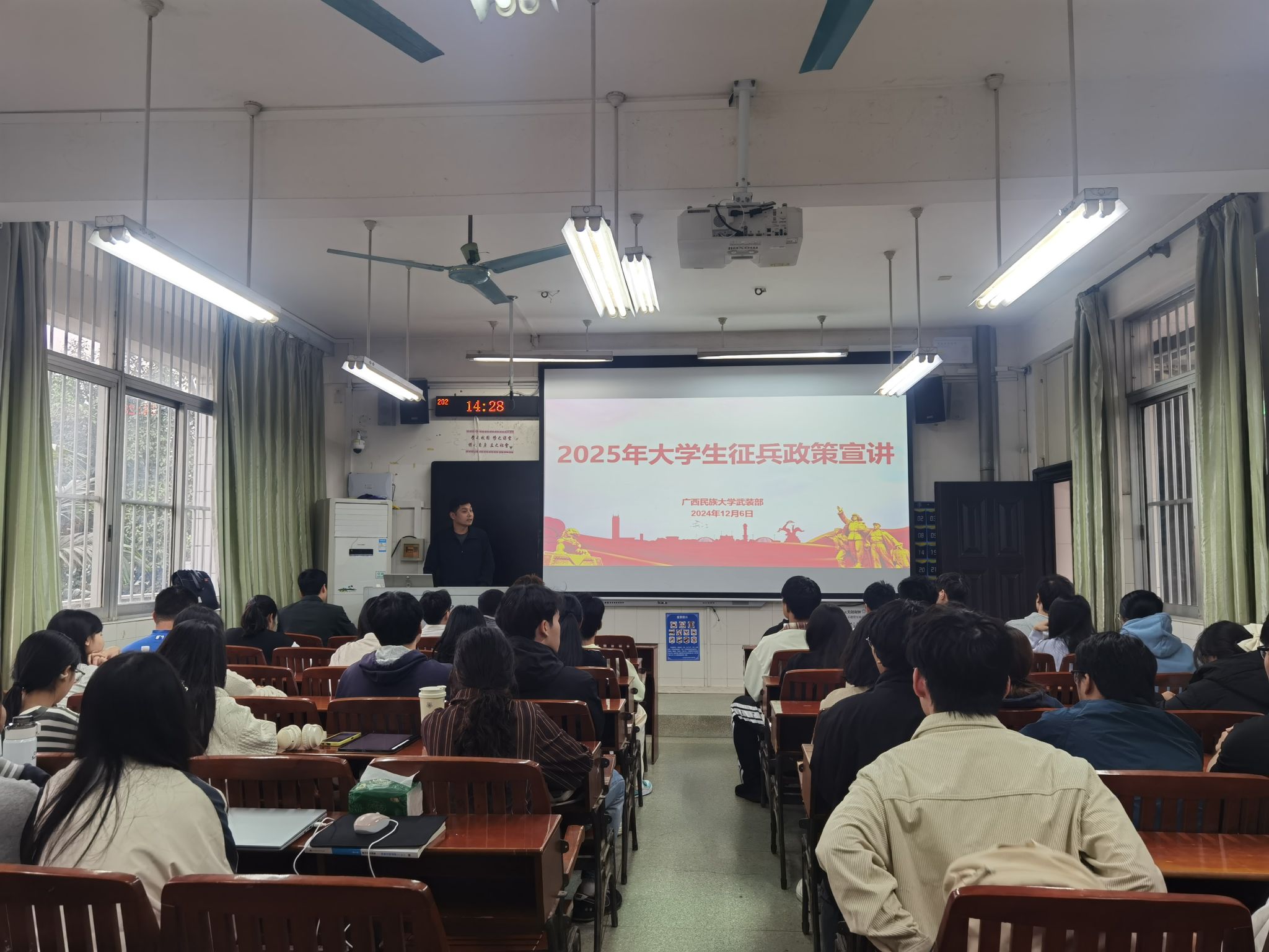 12月6日下午,m88,m88.com于学友楼202室开展2025年大学生征兵政策宣传讲座,讲座由学校武装部王德彬老师主讲,m88,m88.com各班级代表参加讲座。