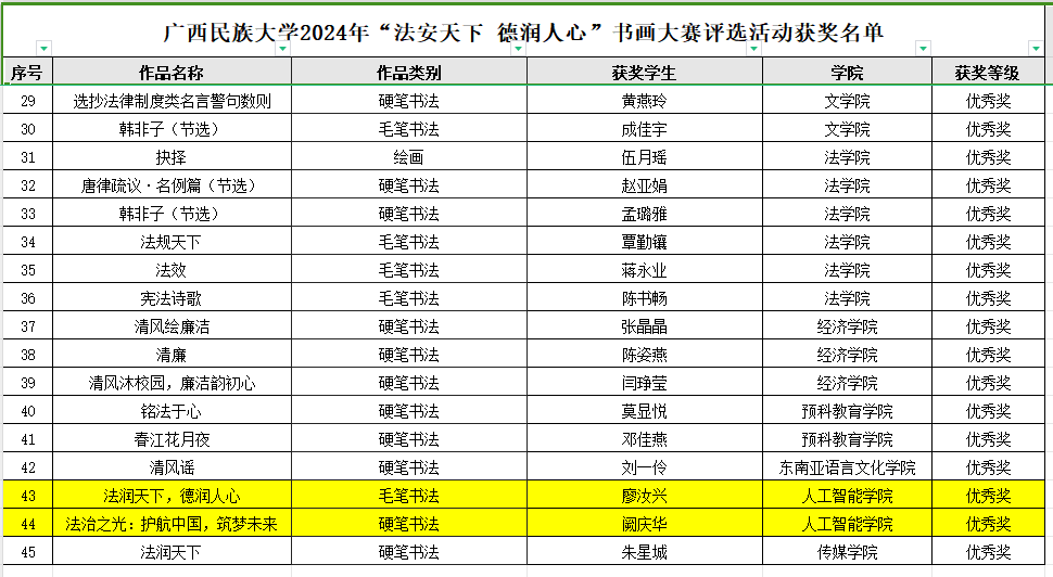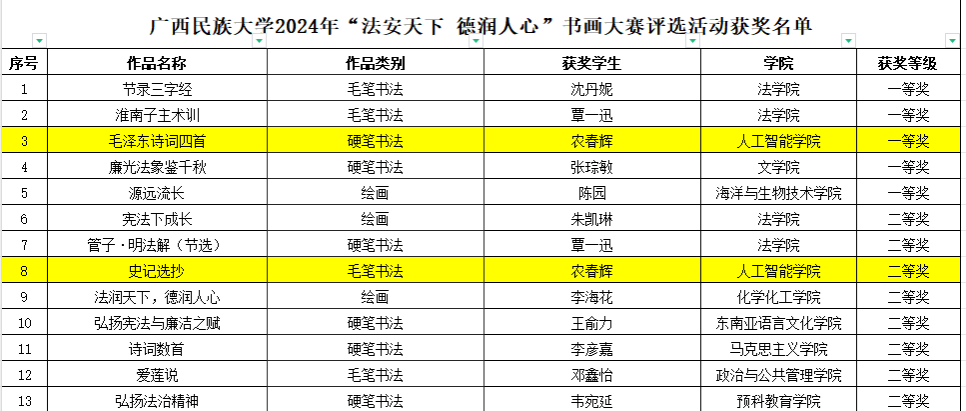 近日,广西民族大学2024年“法安天下·德润人心”主题书画大赛获奖名单公布,m88,m88.com学生农春辉荣获硬笔书法类一等奖以及毛笔书法类二等奖、廖汝兴荣获毛笔书法类优秀奖、阙庆华荣获硬笔书法类优秀奖。
