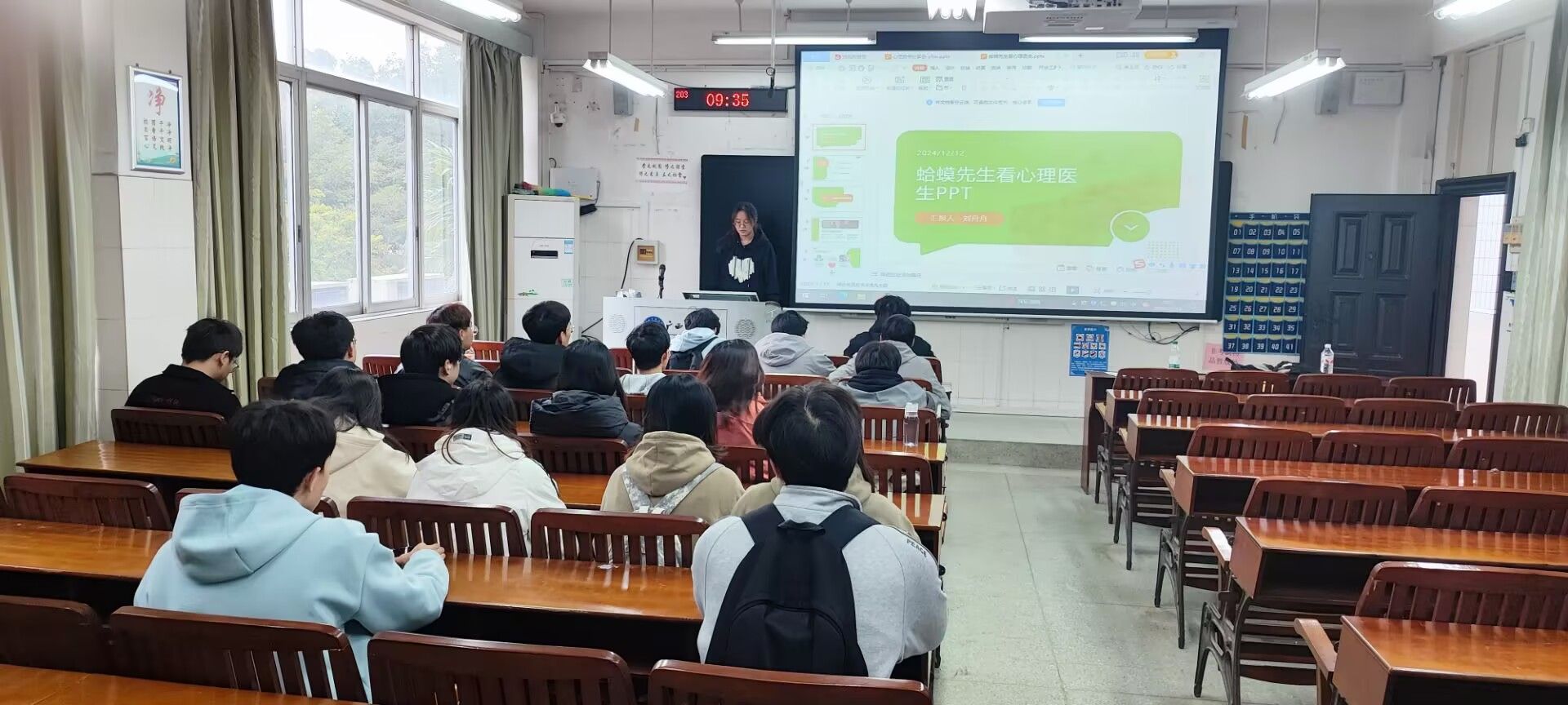 2022级网络工程1班刘舟舟同学在分享《蛤蟆先生去看心理医生》时,绘声绘色的描述了蛤蟆先生从抑郁焦虑、自我怀疑金从而陷入心理困境过程,最后在心理医生的帮助和引导下逐渐敞开心扉的故事。刘舟舟同学表示:“这本书不仅仅是心理咨询的写照,更是一个引人深思的故事,能够引领我们探索自我内心的秘密。”