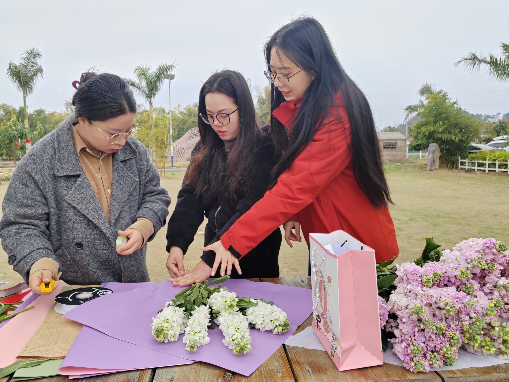 活动设置了“蛇来运转”“原地踏步”“背篓投绣球”“手工扎花”等趣味项目。“蛇来运转”环节中,老师们组成蜿蜒的队伍,在默契配合中感受团队协作的力量;“原地踏步”游戏里,老师们蒙上眼睛完成踏步挑战,在整齐的口号声中体会同事间的信任与支持;背篓投绣球的场地上,彩球纷飞,笑语不断,传递着欢乐与友谊;手工扎花环节中,花香四溢,老师们相互交流扎花技巧,随后将制作好的花束赠与在场的全体女教职工及女家属,并送上“三八”国际妇女节真挚的祝福。