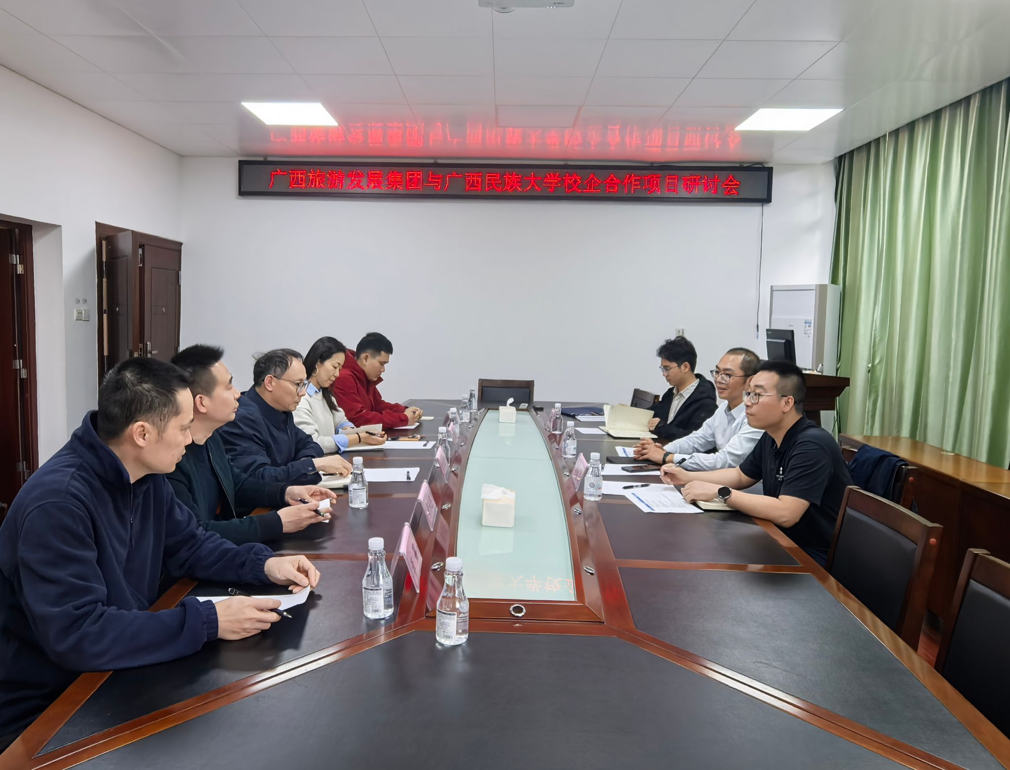 文春明、陈艳艳对阳明智一行的到来表示热烈欢迎,并详细介绍了两个学院的办学概况、专业布局、科研方向及优势等方面的情况。阳明智介绍了广西旅发集团的主要情况和组成部分,并着重阐述了广西旅发集团在数字文旅领域的布局和目标。阳明智表示,当前集团正在全力推进东南亚语言语料库建设项目,亟需高校科研力量支持,并表示希望能与广西民族大学在技术攻关、人才输送、资源共建等方面开展深度合作,共同打造面向东盟的智慧文旅标杆。经过充分讨论,双方达成合作共识,并商定将尽快细化合作框架协议,明确责任分工与阶段性目标,尽快推动项目实质性落地。