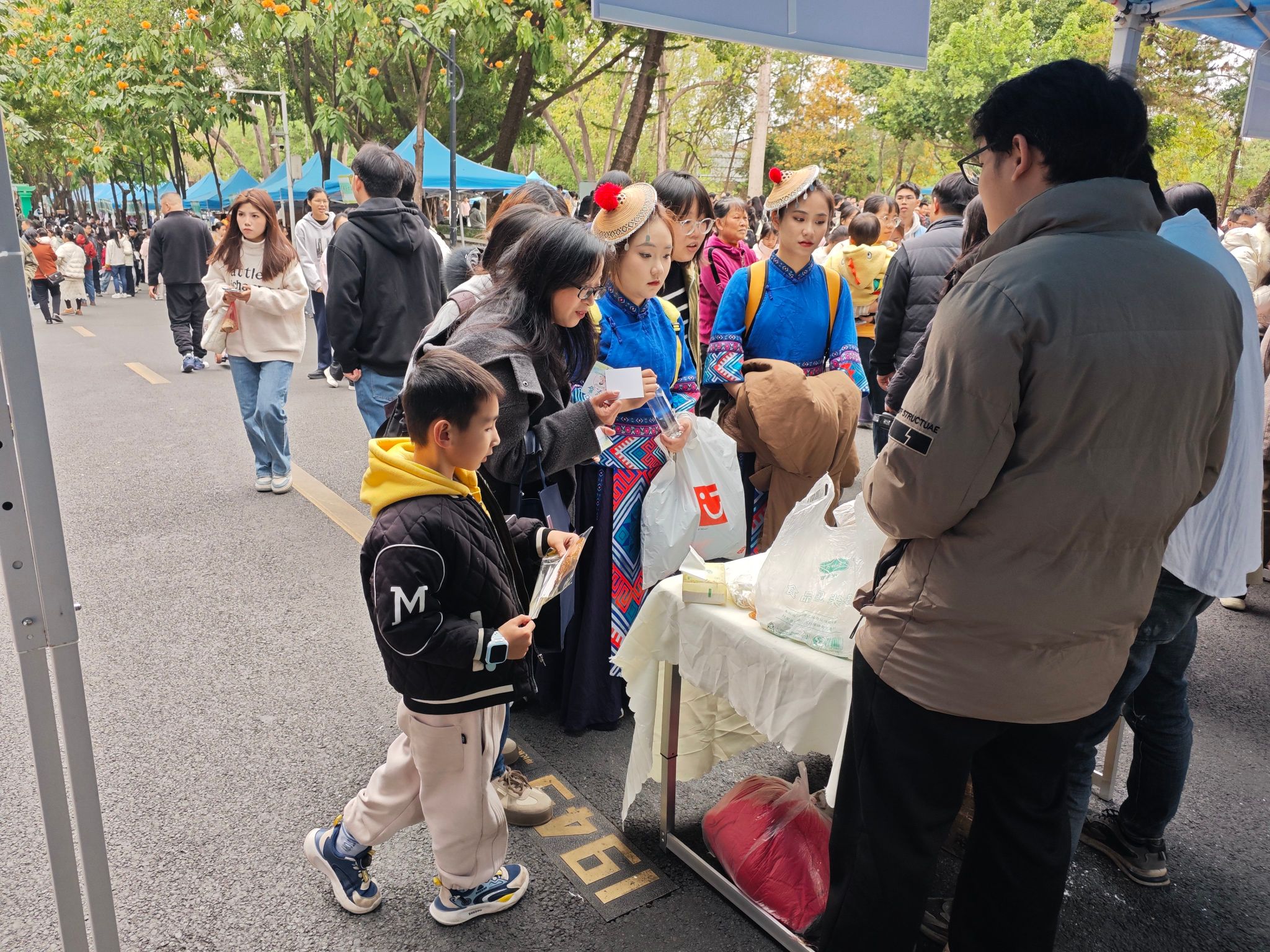 油茶制作展区,工作人员现场演示打油茶。捶打茶叶、加入葱姜蒜等佐料,煮出一锅香气四溢的油茶。师生们端起碗中盛的油茶,初尝苦涩,后觉回甘,在品味中了解少数民族的饮食习俗,感受民族文化底蕴。