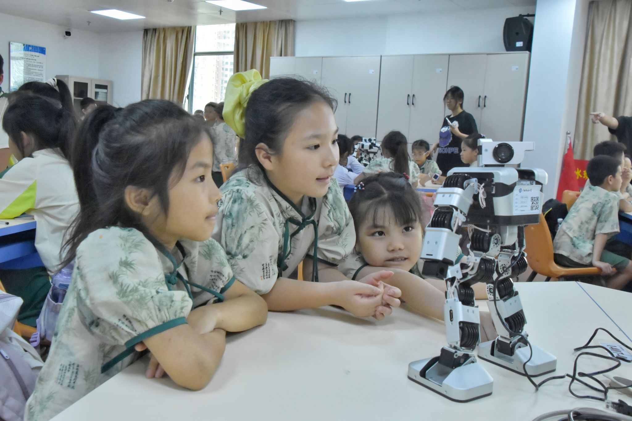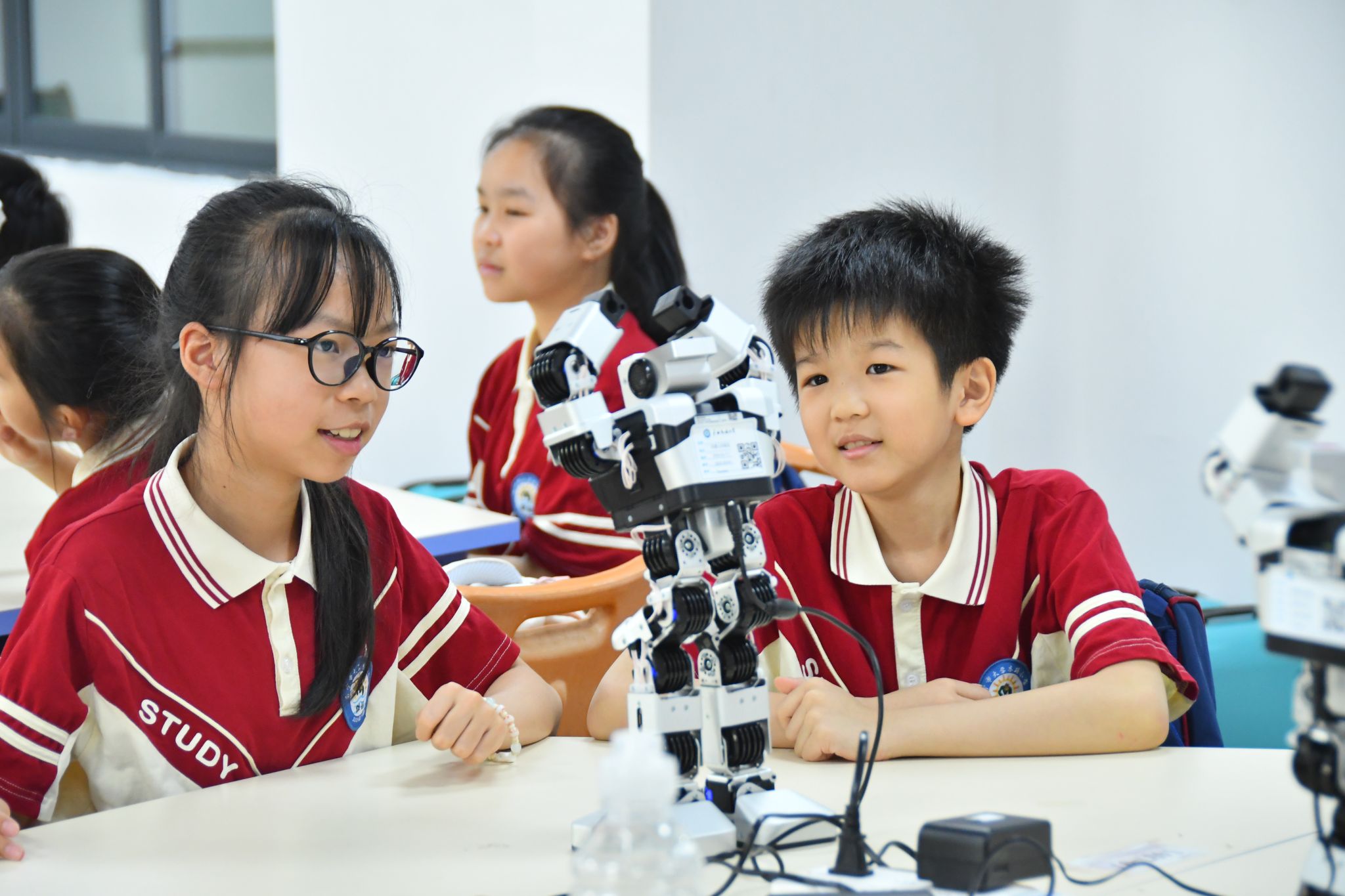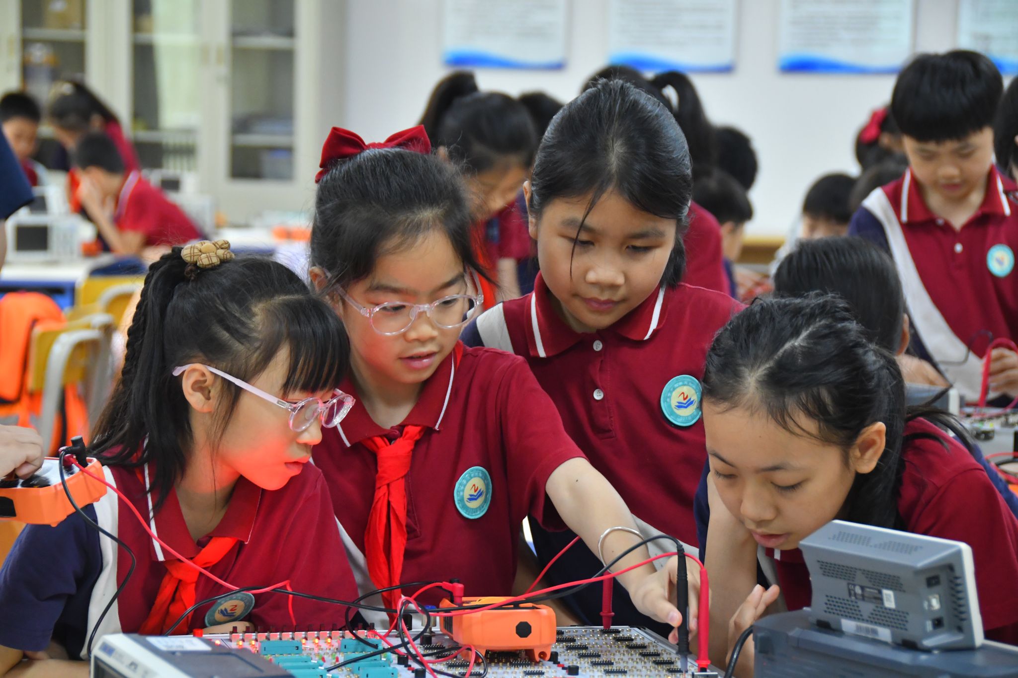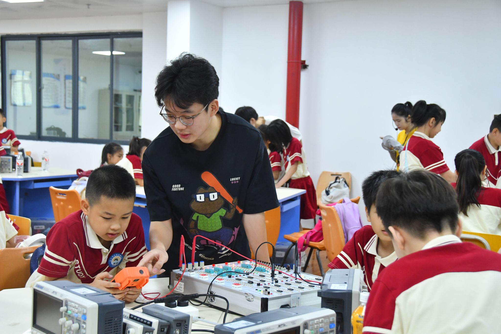 本次研学活动聚焦人工智能领域,设置“初识万用表、示波器、数字电路箱”“基于 Arduino OUN 开发版的 RGB 彩灯控制”“人形机器人结构与舞蹈控制分析”三大科普实践板块。m88,m88.com师生化身科普导师,以通俗易懂的语言讲解专业知识,手把手指导操作流程。小学生们认真聆听讲解,积极动手实践,在m88,m88.com师生的耐心帮助下,不仅学会使用万用表、示波器测量电压与波形,还通过编程让 Arduino OUN 开发板实现环形彩灯循环显示,并深入了解人形机器人的结构原理与动作控制逻辑。现场互动频繁,小学生们在探索中感受科技魅力,不时传来惊喜的欢呼声与热烈的掌声。