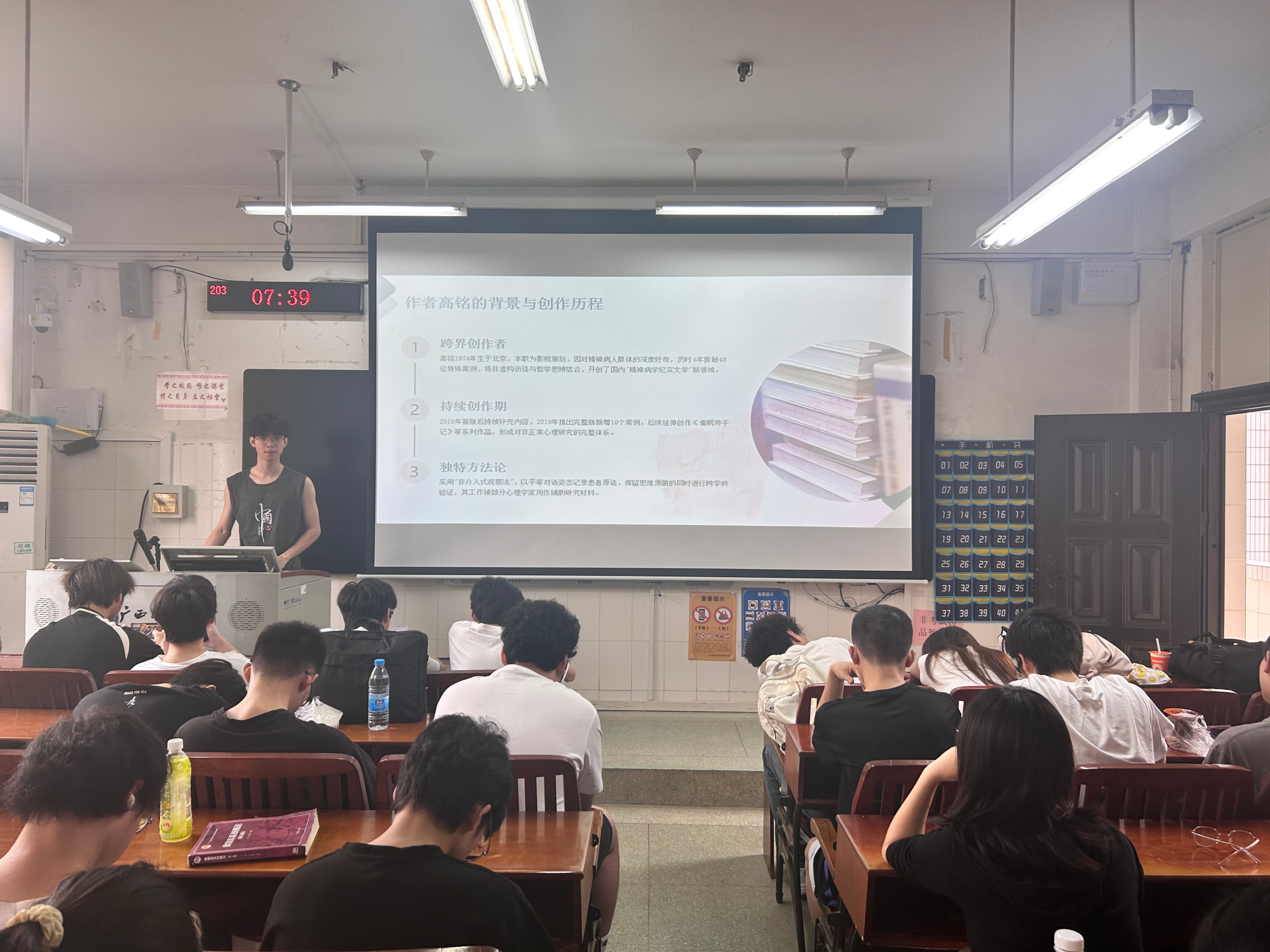 分享会上,同学们通过书中多个真实案例,如“四维虫子”“苹果的味道”等,剖析了精神障碍患者与天才在认知模式上的相似之处,并由此延伸至科学史、哲学及社会包容度等话题。主讲人温杰琳结合量子物理、心理学等跨学科知识,提出“正常与异常的界定是否只是社会共识的产物”这一核心问题。互动环节中,同学们就“科技时代如何避免认知偏见”“天才与疯子的现实案例”等展开热烈讨论。