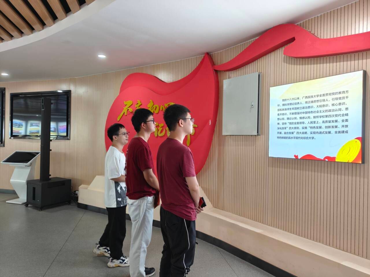 打卡一次校园红色教育基地。全体党员打卡校园内的“百年奋进路”党史学习教育长廊、百花园广西党史教育长廊、铸牢中华民族共同体意识体验园等红色教育基地,用相机捕捉下彼此的笑脸,将这份青春的活力与团结的力量永久定格。