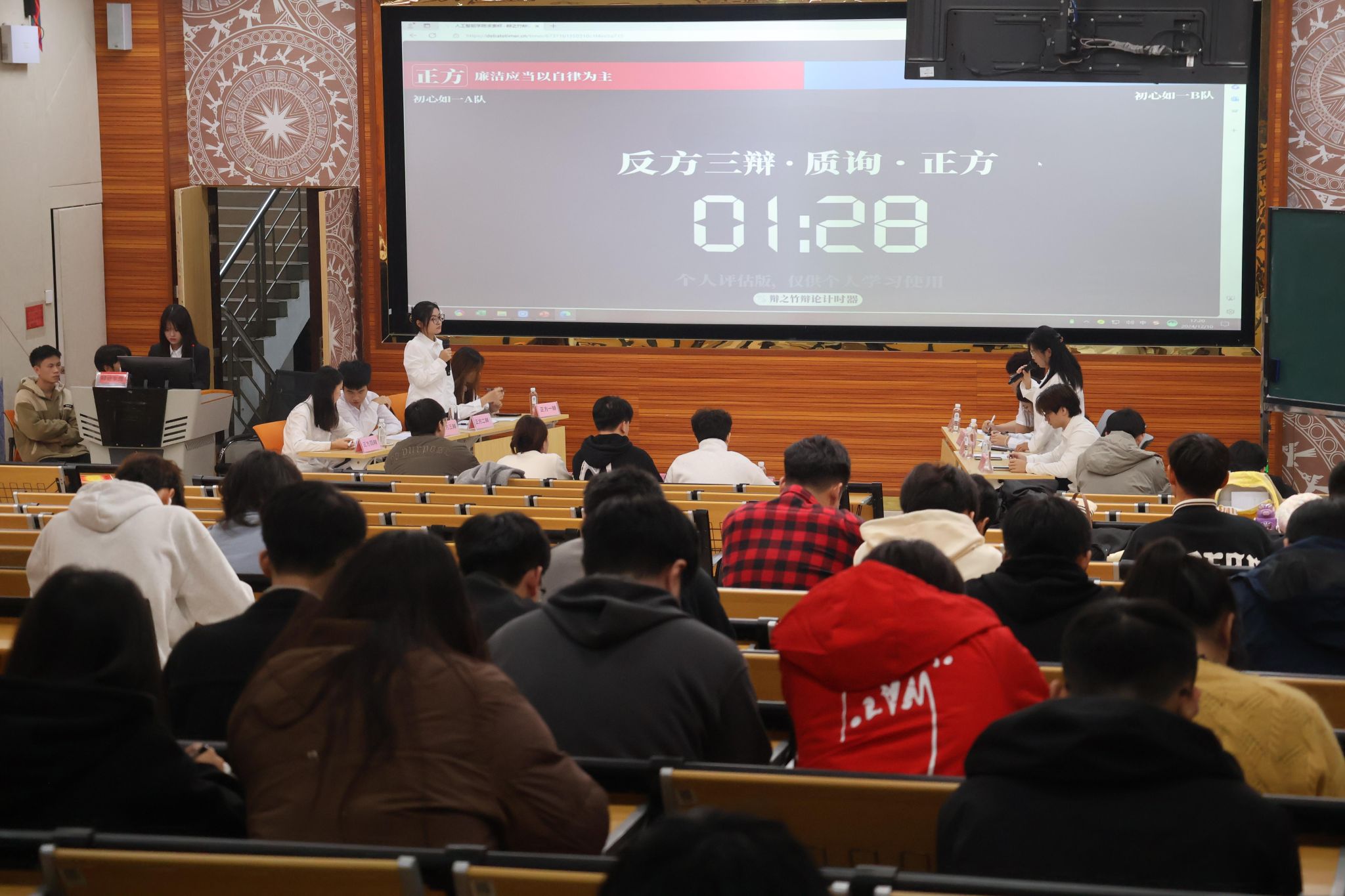 比赛中,双方辩手围绕“廉洁应当以自律为主还是他律为主”这一辩题展开激烈论战。辩手们紧扣各自观点层层推进,旁征博引,侃侃而谈,在一次次来往的言语交锋中和思维碰撞下,让在座的听众能够在唇枪舌剑中受到潜移默化的廉洁文化熏陶。